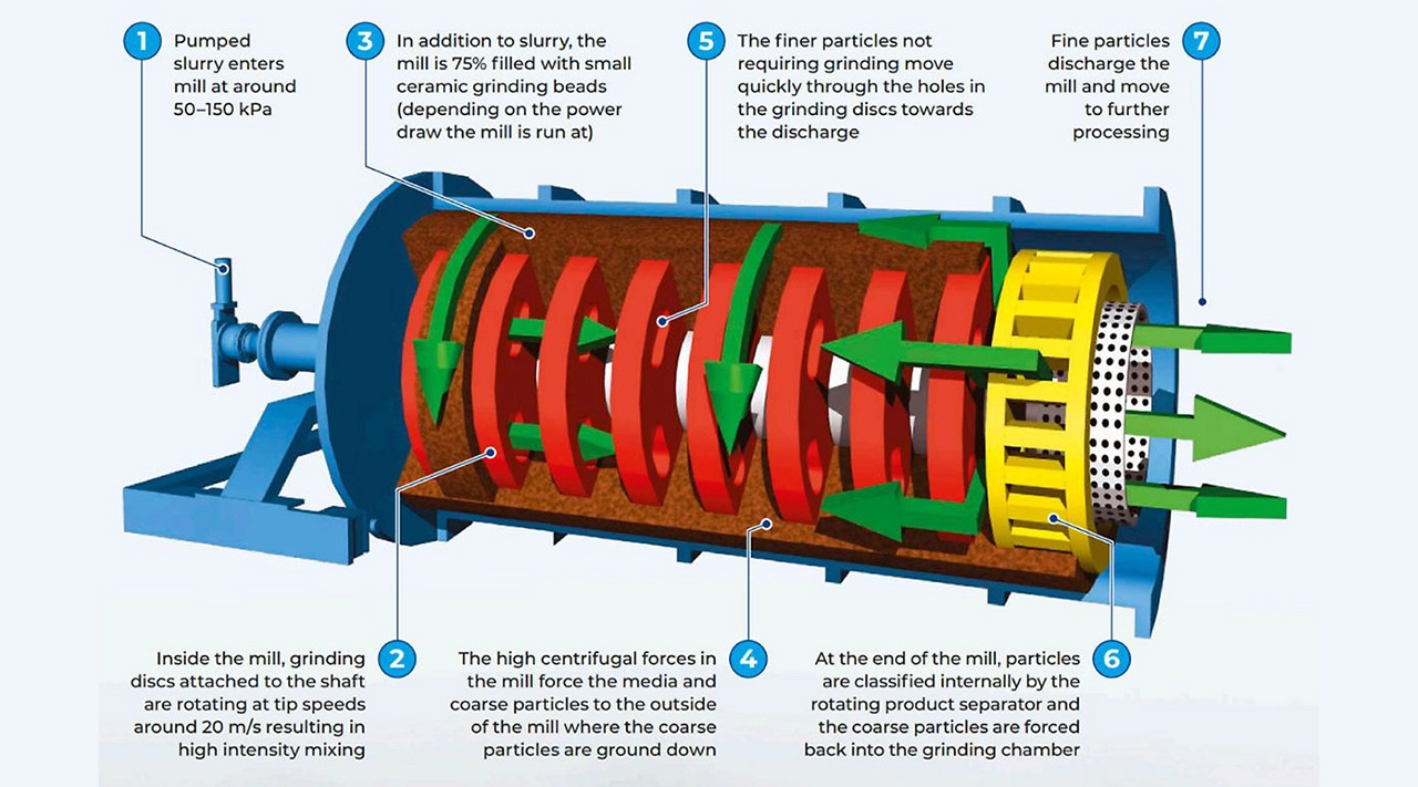 IsaGrind磨机的高效性源于其使用小型研磨介质的能力,这些介质具有高表面积和高介质/颗粒碰撞频率。尽管介质尺寸小,但由于其速度(最高可达22米/秒)较高,仍能有效研磨粗颗粒进料。高功率密度使得磨机体积小巧,停留时间短(不到一分钟),从而避免过度研磨。凭借这一优点,加上8个连续的研磨阶段和产品分离器,产品细度分布均匀,无需外部细度分类。