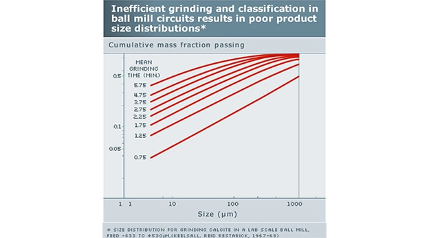 相比之下,IsaGrind磨机产生的细度分布则截然不同。在IsaGrind磨机中进行连续研磨不会使细度分布趋于平缓,反而会使之更加分明,即使在开路状态下也是如此。这一特点会大大提升能源效率,便于下游处理,因为研磨能量集中在需要研磨的粗球上,不会对细颗粒进行过研磨,造成能量浪费。其背后的原因有四个: