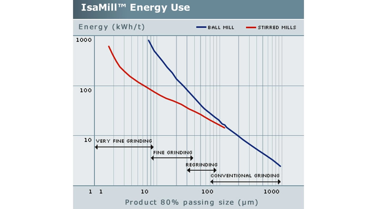 研磨介质粒径越小,其表面积越大,进而促进了更高效的能量传递过程。尽管塔磨机采用完全磨蚀研磨方式,但其研磨介质粒径受限,通常使用12至25毫米的粗球介质,这在一定程度上影响了其研磨效率。相比之下,IsaGrind则能够使用更细小的研磨介质(如1毫米),并具备更高的功率输入强度,从而显著提升了研磨效率。