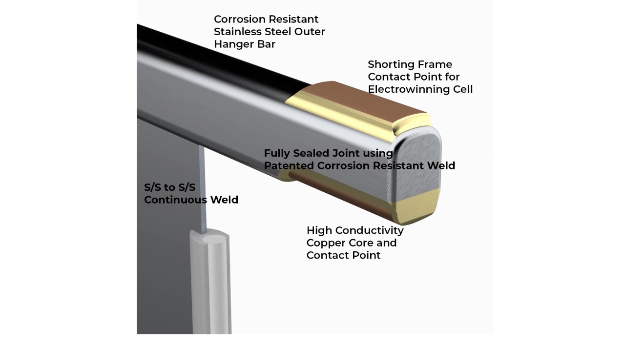 作为永久阴极技术的引领者,嘉能可科技不断定义行业新标准。ISAKIDD 悬挂杆是双相极板技术问世以来的重要创新突破。其创新结构(不锈钢管状悬挂杆内嵌高导电铜芯)兼具优异的电气性能、机械耐久性、耐腐蚀性及更低的全生命周期维护成本。专利焊接工艺确保铜触点与不锈钢悬挂杆间形成气密防腐蚀密封,保障长期可靠运行。ISAKIDD 悬挂杆适用于电解精炼及电积场景,在带通风罩的电积槽等强腐蚀性电积工况中优势尤为显著。