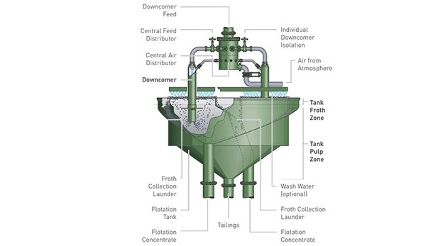Jameson Cell™浮选机的结构主要包括三大区域:降液管、浮选机矿浆区以及浮选机泡沫区。