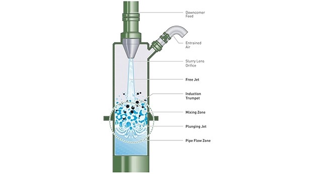 降液管作为Jameson Cell™浮选机的核心组件,是实现气泡与颗粒之间高效接触的关键区域。给料经矿浆喷嘴孔被高压泵送入降液管,形成强劲的高压射流。高压液体射流在切入过程中有效夹带大气中的空气。降液管内部空气的排除产生了真空效应,使得外部液体柱被吸入降液管内部。
