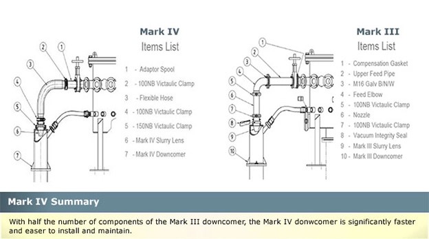 2000年推出的Mark III降液管实现了部件数量的减半,并将所有维护部件巧妙地布置在降液管外部,从而极大地简化了维护工作,提高了维护效率。Mark IV降液管主要由两个核心部件构成:浆液喷管与AISE阀。